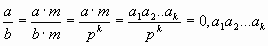Рассмотрим обыкновенные дроби, записываемые с помощью отношения числителя и знаменателя, наибольший общий делитель которых равен 1. Такие дроби будут точно представимы конечной p – ичной дробью, если существует такое натуральное число m, что при умножении на него знаменателя дроби можно получить некоторую степень числа p. Если такое число m существует, умножим числитель и знаменатель на m, представим произведение в p – ичной системе счисления, дополним его до k цифр нулями слева. Полученное число, записанное после запятой, будет p – ичной дробью.