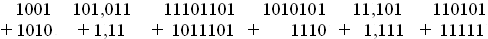 0,0(0110); 0,0(1001); 0,1(1100); 0,010(0011); 101101,01(1001);