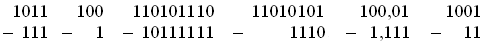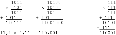 11 *11; 1011*101; 10100*1010; 11,1*1,11; 10,11 * 11,1;