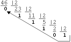 Процесс деления заканчивается, когда частное станет строго меньше Р — это будет старший (левый) разряд числа; затем последовательно выписываем остатки от деления, начиная с последнего:4610 = 1011102. |