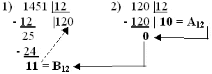 Пример 22. Перевод 1451 в 12-чную систему счисления:
