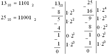 Пример 24. Перевести числа 13 и 25 из десятичной системы счисления в двоичную с помощью компьютерного алгоритма.