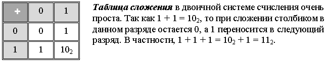 Рассмотрим более подробно двоичную арифметику, т.к. именно в этой системе производятся компьютерные вычисления.