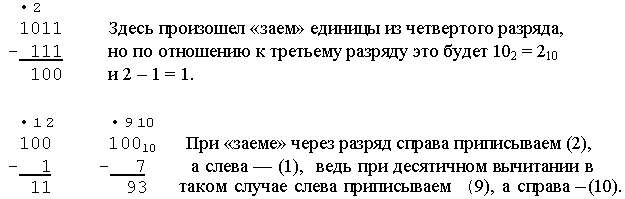 При вычитании важно помнить следующее: когда необходимо провести “заем единицы” бóльшего разряда, то в десятичной системе счисления такая “единица” равна 10. Значит в P-ичной системе счисления это будет число, равное P. Тогда в двоичной системе счисления “занимается” число 2, и, при вычитании из него единицы, получим единицу, а не ноль!