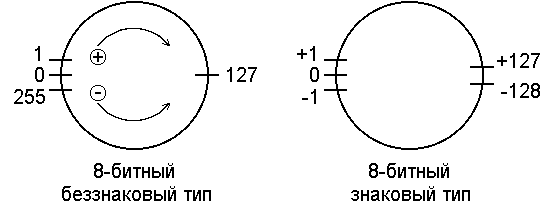 Рисунок 1. Арифметика в 8-ми разрядной ячейке памяти для беззнакового и знакового типов.