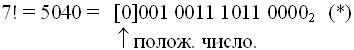 8! = 7!x 8 = 7!x 23– это в двоичной арифметике сдвиг на 3 позиции вправо. Если мы сдвинем число (*) на 3 позиции вправо, то получим в знаковом разряде единицу, т.е. отрицательное число. Если перевести его из дополнительного кода, получим: