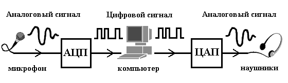 Процесс цифровой записи и воспроизведения звука схематично изображен на рис. 3. Микрофон преобразует звуковой сигнал в колебания напряжения, а аналого-цифровой преобразователь (АЦП) через строго определенные интервалы времени замеряет амплитуду аналогового сигнала. По мере того, как преобразователь снимает показания, каждому интервалу ставится в соответствие 8-битное число — чем выше измеренное напряжение, тем больше число и наоборот. Частота таких измерений — несколько тысяч раз в секунду. Получившуюся цепочку 8-битных чисел записывают в память компьютера в виде файла с расширением wav. Обратная конверсия цифрового сигнала в непрерывный сигнал осуществляется с помощью цифроаналогового преобразователя (ЦАП).