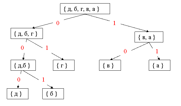 Код символа получается движением от корня к листьям. В результате получим следующие коды символов: