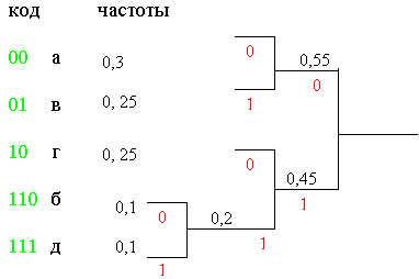 Теперь объединим вместе два более редких символа нового алфавита, «б1» и, к примеру, «г». Верхнему приписываем 0, нижнему 1. Теперь они считаются одним символом с относительной частотой 0,2+0,25=0,45. Опять находим два символа с наименьшими частотами и объединяем их в один. Теперь это символы «а» и «в». Верхнему приписываем 0, нижнему 1. Их суммарная относительная частота 0,3+0,25=0,55. Осталось объединить последние два символа, верхнему приписываем 0, нижнему 1.