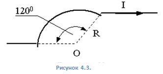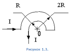 3. 3. Бесконечно длинный провод с током 100 А изогнут так, как это показано на рисунке 1.3. Вычислите магнитную индукцию в точке О и укажите на рисунке её направление. Радиус дуги 10 см.