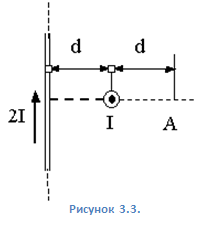 3. 3. По двум скрещенным под прямым углом бесконечно длинным проводам текут токи I и 2I, где I = 100 А. Вычислите магнитную индукцию в точке А (рисунок 3.3) и покажите её направление на рисунке. Расстояние d = 10 см.
