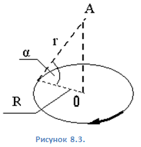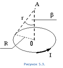 3. 3. По тонкому кольцу течёт ток 80 А. Вычислите магнитную индукцию в точке A, равноудалённой от точек кольца на расстояние 10 см (рисунок 8.3). Покажите на рисунке направление вектора магнитной индукции в точке A. Угол б = р/6 рад.