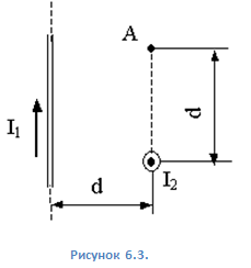 индукцию в точке A, равноудаленной от проводов на расстояние d = 10 см (рисунок 6.3.) и