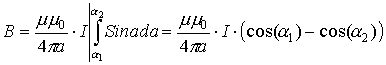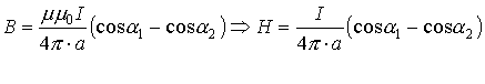 Назовем предельные углы α1 и α2 как углы, под которыми из искомой точки видны концы проводника, создающего магнитное поле. Тогда для конечного проводника с током это будет выглядеть так:
