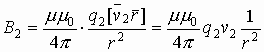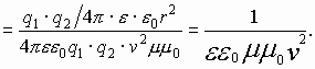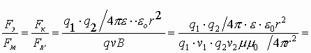 Магнитное поле, действующее на заряд, создается другим зарядом, движущимся относительно первого. Предположим, что ν1=ν2, заряды находятся на расстоянии r друг от друга. Возьмем