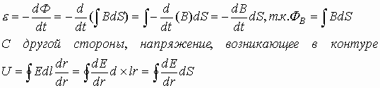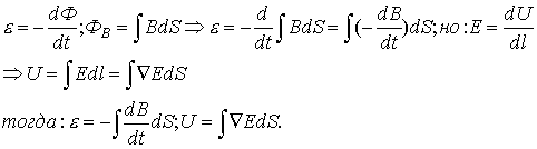 Напряжение, выраженное через законы электростатики, и ЭДС, возникшее в контуре, есть одно и то же. Тогда интегралы равны между собой, а, следовательно, и подинтегральные выражения равны.