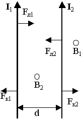 Вблизи каждого проводника с током формируется магнитное поле (сила, действующая на проводник с током, определяется по правилу левой руки: магнитные силовые линии входят в ладонь, ток по вытянутым пальцам, тогда сила направлена по отогнутому большому пальцу)