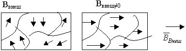 Для объяснения ферромагнетизма вводим понятие доменов. Домен - совокупность атомов с одинаковым направлением собственных магнитных полей. Подобные совокупности атомов требуют меньше энергии для образования доменов, т.е. энергетически более выгодны по сравнению с разрозненными атомами. В целом собственное магнитное поле вещества равно нулю. Под действием внешнего магнитного поля домены могут увеличиваться за счет других доменов вплоть до поглощения неориентированных доменов, то есть все пространство вещества заполняется доменами, ориентированными вдоль поля. При снятии внешнего поля обратной переориентации не происходит, так как это энергетически не выгодно. В этом случае магнитная восприимчивость составляет тысячи и десятки тысяч единиц. Оказывается, реакция вещества на воздействие внешнего магнитного поля носит нелинейный характер. Это определяется способностью собственных магнитных моментов переориентироваться во внешнем магнитном поле. Сначала идёт резкое изменение ориентации во внешнем магнитном поле, магнитные моменты ориентируются вдоль силовых линий магнитного поля. Дальнейшее увеличение магнитного поля не изменяет намагниченность, так как все магнитные моменты уже ориентированы вдоль поля. Зависимость результирующего магнитного поля в веществе в целом в зависимости от внешнего поля носит характер гистерезиса.