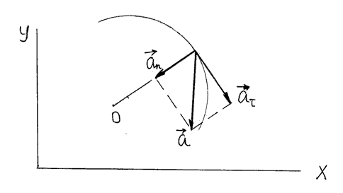 Вращающаяся точка имеет тангенциальное ускорение, равное аτ=dv/dt, оно изменяет скорость по величине и направлено по касательной к траектории; и нормальное ускорение, равное аn= v2/R, оно меняет направление скорости и направлено по радиусу окружности (R) (см. Pисунок 3)