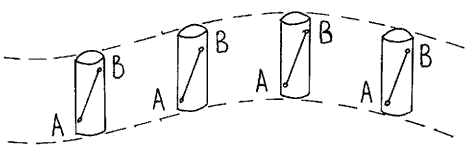 Примеры. 1) В аттракционе "Колесо обозрения" кабинки - люльки, в которых сидят люди, двигаются поступательно. 2) Если стакан с водой перемещать по траектории, представленной на рисунке 5 так, чтобы поверхность воды и направляющая стакана составляли бы прямой угол, то движение стакана является не прямолинейным, но поступательным. Прямая АВ остается при движении стакана параллельна самой себе.