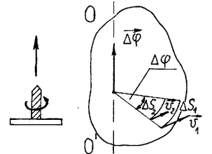 При малых промежутках времени, когда углы поворота невелики, их можно рассматривать как векторы, хотя и не совсем обычные. Вектор элементарного (бесконечно малого) угла поворота ∆φ направлен вдоль оси вращения по правилу правого буравчика, его модуль равен углу поворота (Рисунок 5). Вектор ∆φ называется угловым перемещением.