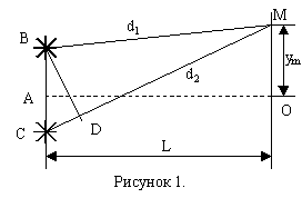 Рисунок 1. В точке М наблюдается максимум m-ого порядка. Обозначим расстояние от центра экрана до точки М – ym. Воспользуемся геометрией рисунка 1. Отрезок CD=d2-d1. Треугольники BCD и AMO – подобны. Из подобия