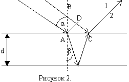 На тонкую плёнку толщиной d и показателем преломления n падает монохроматический свет с длиной волны λ. Угол падения α. Среда около плёнки – воздух. Определим условие наблюдения максимума и минимума интерференции на тонкой плёнке. Интерферирующие лучи показаны на рисунке 2. Часть первого луча проходит через плёнку, преломляясь на границе раздела, отражается от нижней границы плёнки и выходит в точке С. Часть второго луча отражается от верхней поверхности плёнки и в точке С интерферирует с лучом 1. Обозначим Δ – оптическую разность хода волны.