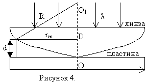 где d – толщина зазора между линзой и пластиной, где наблюдается интерференция, n – показатель преломления прослойки, λ/2 – потеря полволны при отражении 1-ой волны от стеклянной пластинки (при условии n<nстекла).