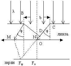 Параллельные лучи BM и CN, идущие от краёв щели под углом дифракции φ, собираются линзой в побочном фокусе Fφ.