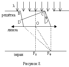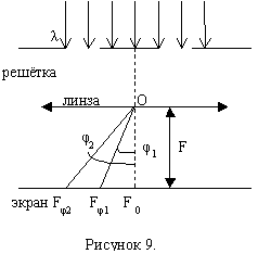 Период дифракционной решётке d, число щелей N. В спектре k-ого порядка на экране (рисунок 9) под углом φ1 наблюдается максимум для длины волны λ1, а под углом дифракции φ2 – максимум для волны с λ2. (Fφ1 θ Fφ2 – ρоответственно), максимумы для двух длин волн на экране пространственно разделены, если выполняется условие: