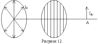 Определим интенсивность прошедшей волны в точке А, если анализатор повернуть на угол α вокруг направления распространения луча. Через анализатор пройдёт электрический вектор, величина