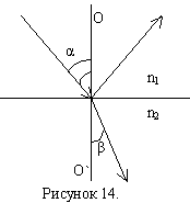 Часть световой волны отражается, а часть преломляется, распространяясь во второй среде. На рисунке: φ – угол падения луча, β – угол преломления, n2 – показатель преломления стекла, n1 - показатель преломления воздуха, n1=1.