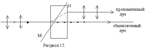 Вдоль второго луча распространяется необыкновенная волна. Показатель преломления луча для неё nе. угол преломления для необыкновенного луча зависит от того, как ориентирована поверхность пластинки по отношению к оптической оси кристалла MN. Угол преломления равен нулю в двух случаях: