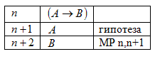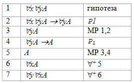 Понятие выводимой формулы определяется так же, как и в исчислении высказываний.| 1. | гипотеза | |