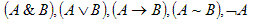 Алфавит логики высказываний содержит следующие символы: высказывательные переменные – обычно заглавные латинские буквы; логические символы, символы скобок (, ).