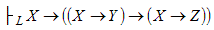 Выводимость формул в теории L доказывается путем предъявления конкретного вывода, т.е. последовательности формул, удовлетворяющих определению. Для удобства формулы последовательности вывода располагаются друг под другом в столбик, а справа указывается на каком основании формула включена в вывод. В качестве примера приведем доказательства двух теорем.
