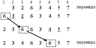 Процесс построения пирамиды выглядит следующим образом. Дана последовательность as+1,…,ak, которая является (s+1, k)-пирамидой. Добавим новый элемент х и поставим его на s-тую позицию в последовательности, т.е. пирамида всегда будет расширяться влево. Если выполняется (*), то полученная последовательность – (s, k)-пирамида. Иначе найдутся элементы a2s+1,a2s такие, что либо a2s < as либо a2s+1 < as.