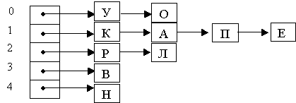 Пример. Составить хеш-таблицу для строки КУРАПОВА ЕЛЕНА. Будем использовать номера символов в алфавитном порядке. Пусть m=5,