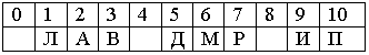 Просмотр элементов хеш-таблицы на этом заканчивается несмотря на то, что в таблице еще имеются незаполненные ячейки, поскольку следующее значение d уже не будет строго меньше m=11. Таким образом, для данной строки не удается построить хеш-таблицу с m=11. Заполненная часть хеш-таблицы выглядит следующим образом