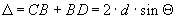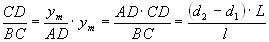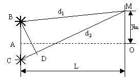 В точке М наблюдается максимум m-ого порядка. Обозначим расстояние от центра экрана до точки М – ym. Воспользуемся геометрией рисунка 1. Отрезок CD=d2-d1. Треугольники BCD и AMO – подобны. Из подобия