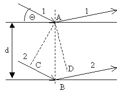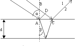 На тонкую плёнку толщиной d и показателем преломления n падает монохроматический свет с длиной волны λ. Угол падения α. Среда около плёнки – воздух. Определим условие наблюдения максимума и минимума интерференции на тонкой плёнке. Интерферирующие лучи показаны на рисунке 2. Часть первого луча проходит через плёнку, преломляясь на границе раздела, отражается от нижней границы плёнки и выходит в точке С. Часть второго луча отражается от верхней поверхности плёнки и в точке С интерферирует с лучом 1. Обозначим Δ – оптическую разность хода волны.
