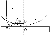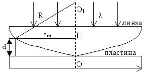где d – толщина зазора между линзой и пластиной, где наблюдается интерференция, n – показатель преломления прослойки, λ/2 – потеря полволны при отражении 1-ой волны от стеклянной пластинки (при условии n<nстекла).