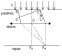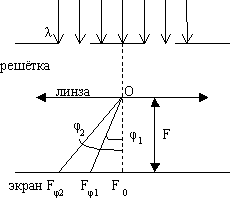 F0 – центр дифракционной картины, где интерферируют лучи, угол дифракции которых равен нулю. В F наблюдается центральный дифракционный максимум.