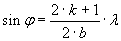 Ширина щели BC=b, длина волны, падающего света λ. Свет падает на щель нормально к её поверхности так что колебания во всех точках щели совершаются в одной фазе. О – оптический центр линзы. Дифракционная картина наблюдается на экране, который установлен в фокальной плоскости линзы. φ – угол дифракции, или угол отклонения от прямолинейного распространения падающих волн, который может принимать значения от 0 до