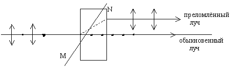в обыкновенных и необыкновенных волнах условно показаны на рисунке точками на обыкновенном луче и поперечными чёрточками на необыкновенном. Предполагается, что оба луча и пересекающая их оптическая ось MN кристалла лежат в плоскости рисунка.