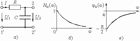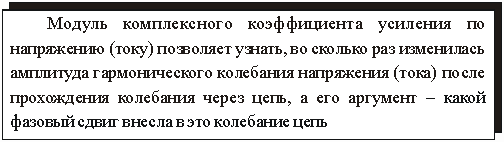 т. е. модуль комплексной передаточной функции по напряжению (или комплексного коэффициента усиления по напряжению) показывает во сколько раз изменяется действующее значение (амплитуда) гармонического колебания напряжения на выходе цепи по сравнению с аналогичным значением на входе цепи, а аргумент этой функции определяет сдвиг фаз между гармоническими колебаниями напряжения на входе и выходе.