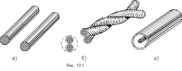 Первичные параметры. Длинные линии могут иметь самую различную конструкцию. Так, двухпроводная воздушная линия (рис. 13.1, а) состоит из параллельных неизолированных проводов, укрепленных с помощью изоляторов на специальных опорах. Симметричная кабельная цепь представляет собой два изолированных скрученных друг с другом провода, образующих так называемую пару (рис. 13.1, б). Скрученные между собой пары (или четверки), заключенные в металлическую или пластмассовую защитную оболочку, образуют симметричный кабель.
