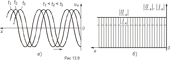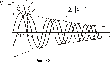 Если в момент времени t1 сделать фотографию распределения, например, напряжения uxпад вдоль линии, то она будет иметь вид кривой 1 (рис. 13.3). В следующий момент t2 фаза напряжения в каждой точке линии изменится на величину w(t2 – t1), и вся картина как бы сместится вдоль оси х вправо (кривая 2 на рис. 13.3). Аналогичная ситуация будет наблюдаться и в момент времени t3 > t2 (кривая 3 на рис. 13.3).