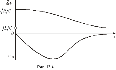 На рис. 13.17 показано распределение по длине линии модуля комплексной амплитуды напряжения. В линии будут отсутствовать узлы и пучности, а будут наблюдаться минимумы и максимумы амплитуды волн.