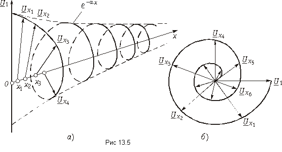 В каждом сечении линии (т. е. в каждой точке х) колебания напряжения и тока являются гармоническими. Амплитуда этих колебаний уменьшается по мере удаления от начала линии по закону е–aх. В каждой последующей точке линии колебания отстают по фазе от колебаний в предыдущей точке (на это указывает знак «минус» перед bх).